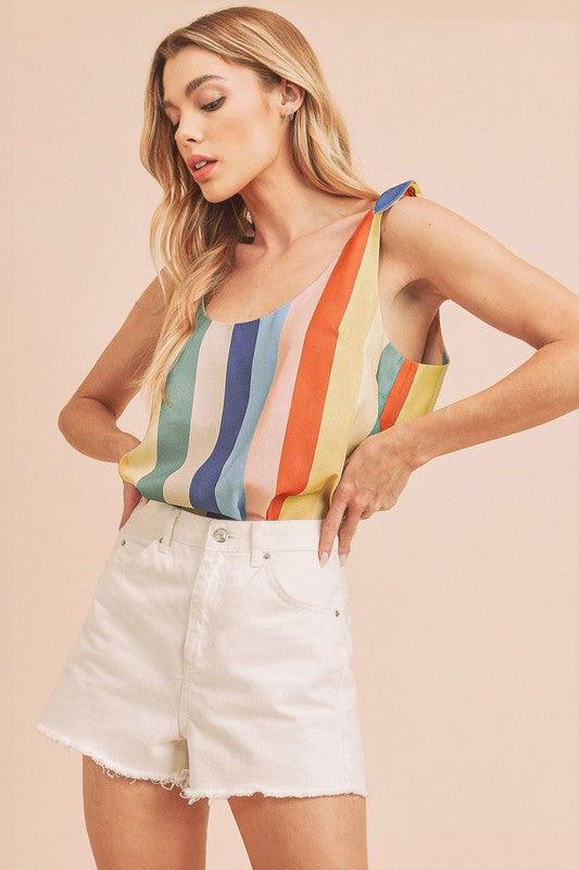 Aemi + Co Contrast Striped Scoop Neck Tie Shoulder Tank