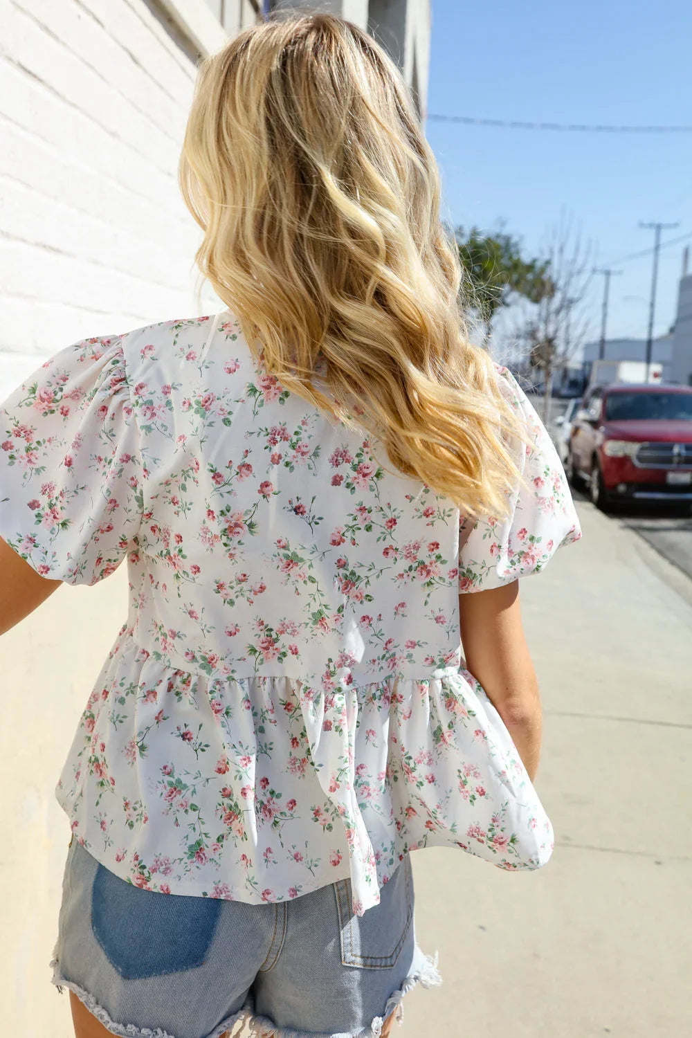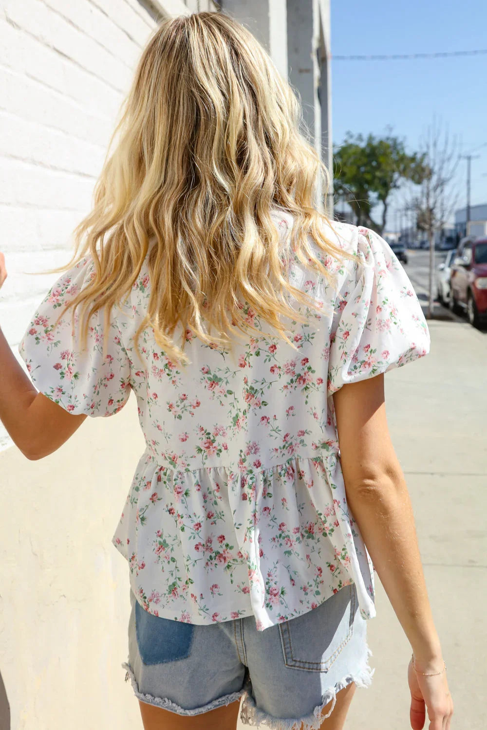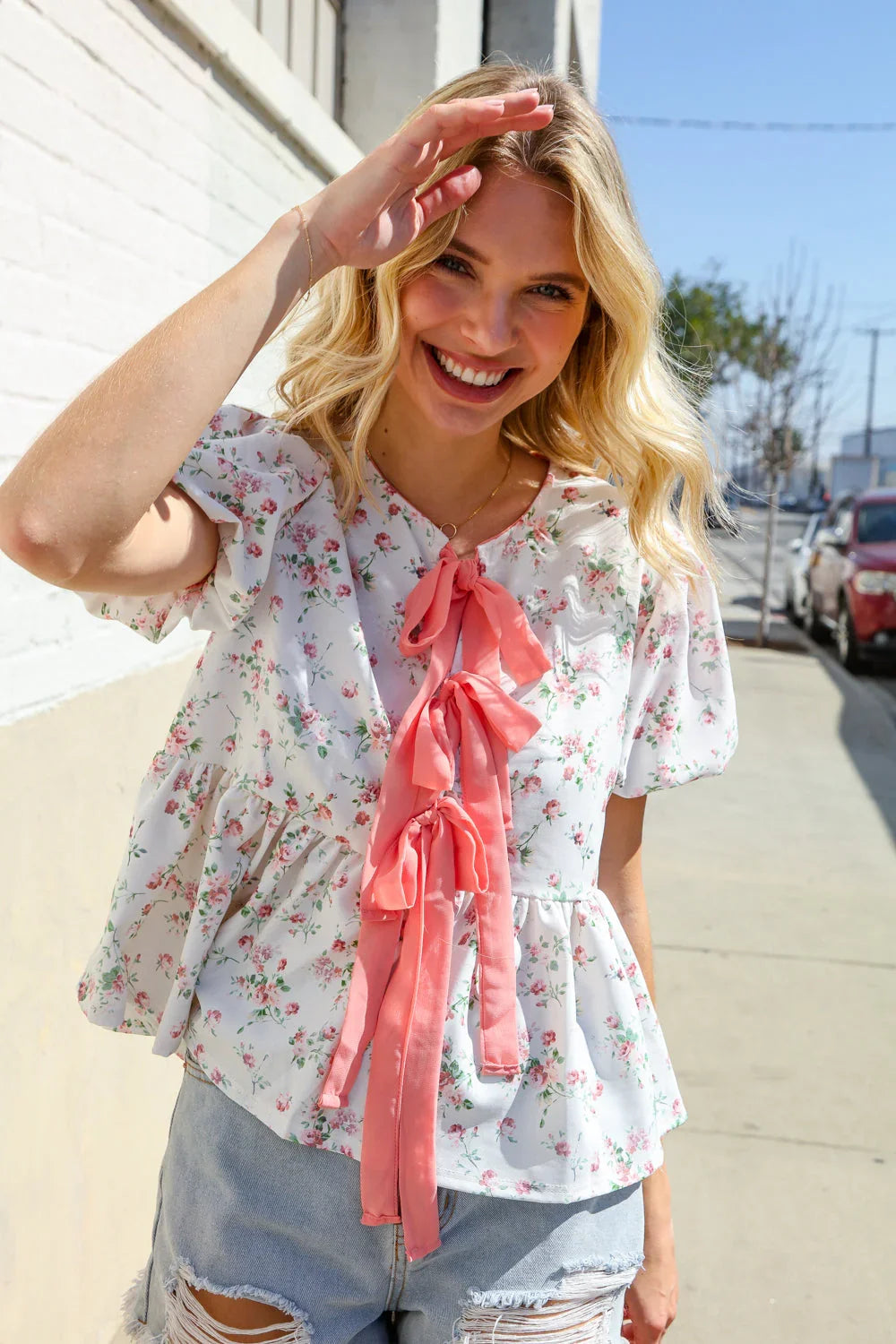 Designed with silky ribbon bow ties and a vintage floral fabric, this woven babydoll top with folded puff sleeves is versatile and will brighten up any room or occasion you wear it to. Be prepared to stun!