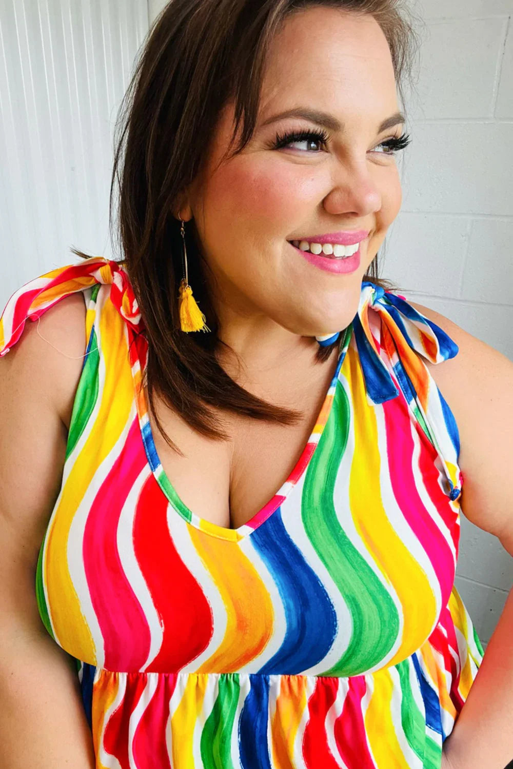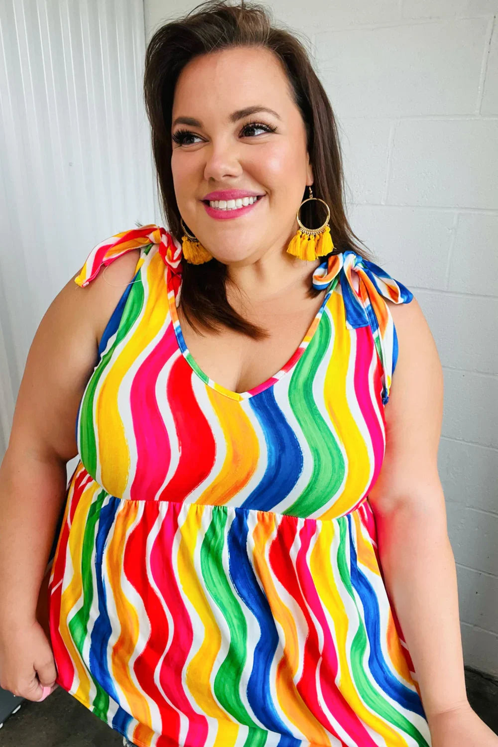 Multicolor Wavy Stripe Shoulder Tie Detail Top