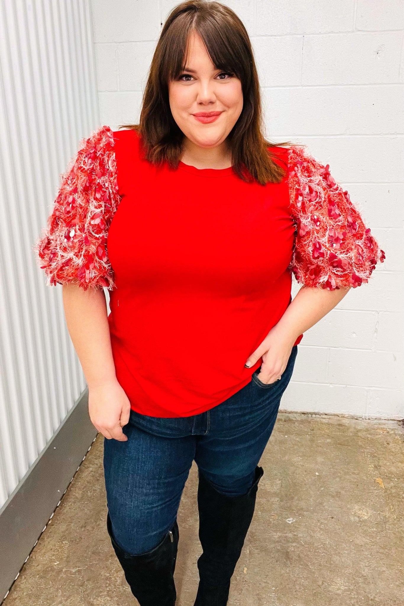 Come To Me Red Sequin Puff Short Sleeve Top