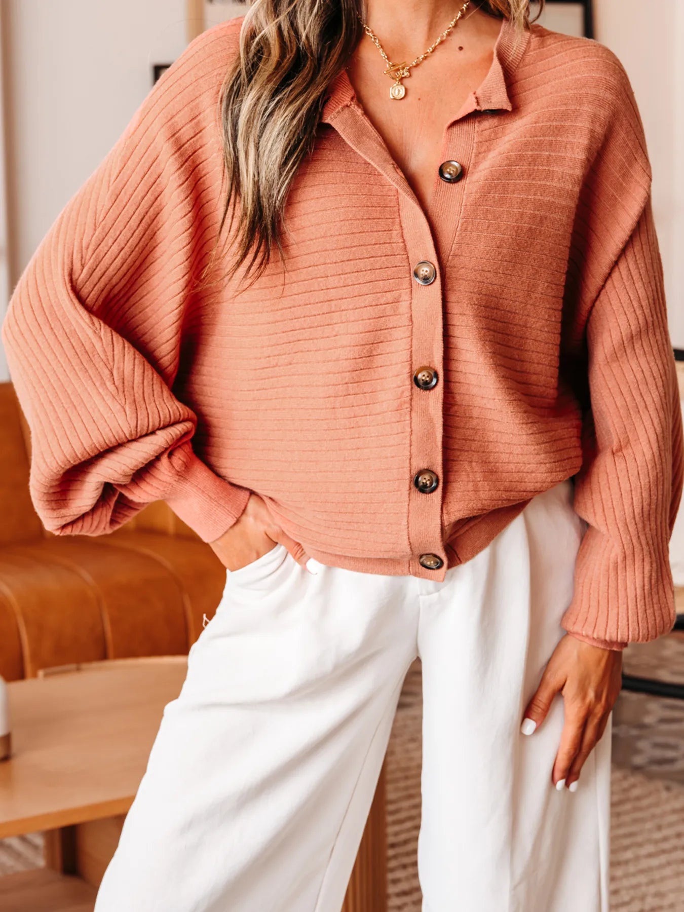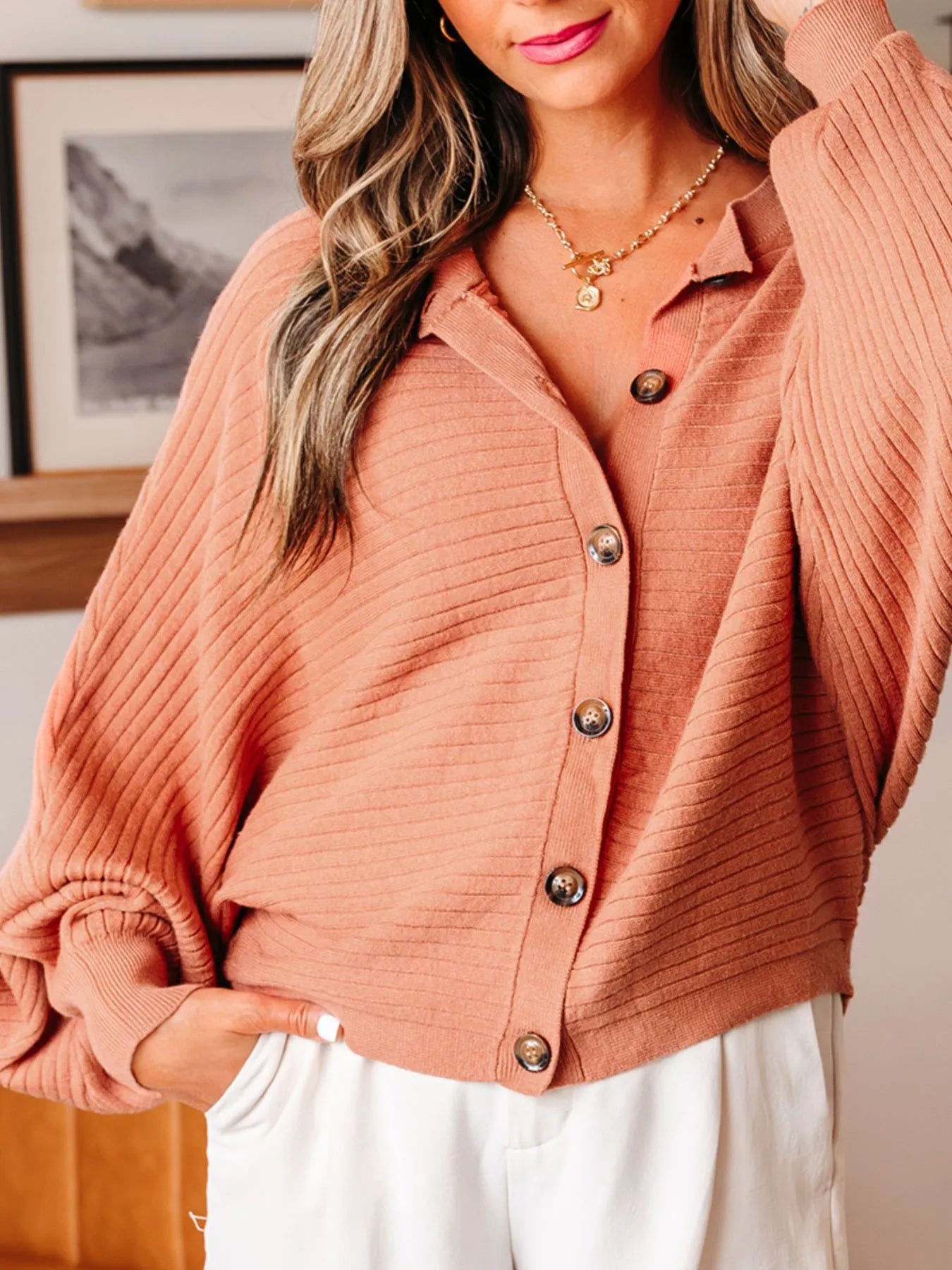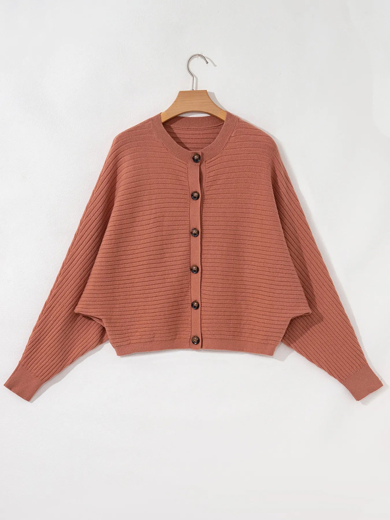 Women’s Burnt Coral Rib Knit Button Front Dolman Sleeve Cardigan Sweater