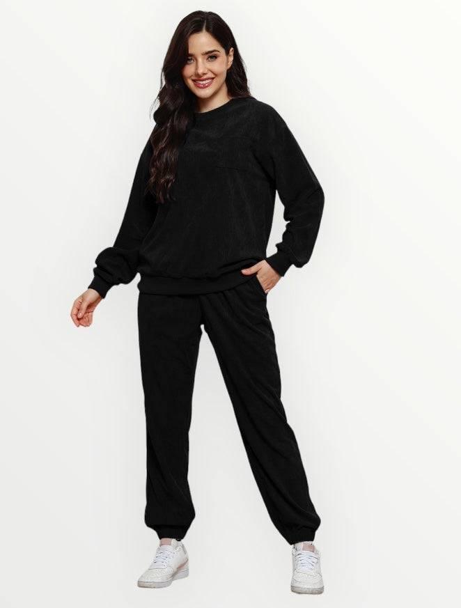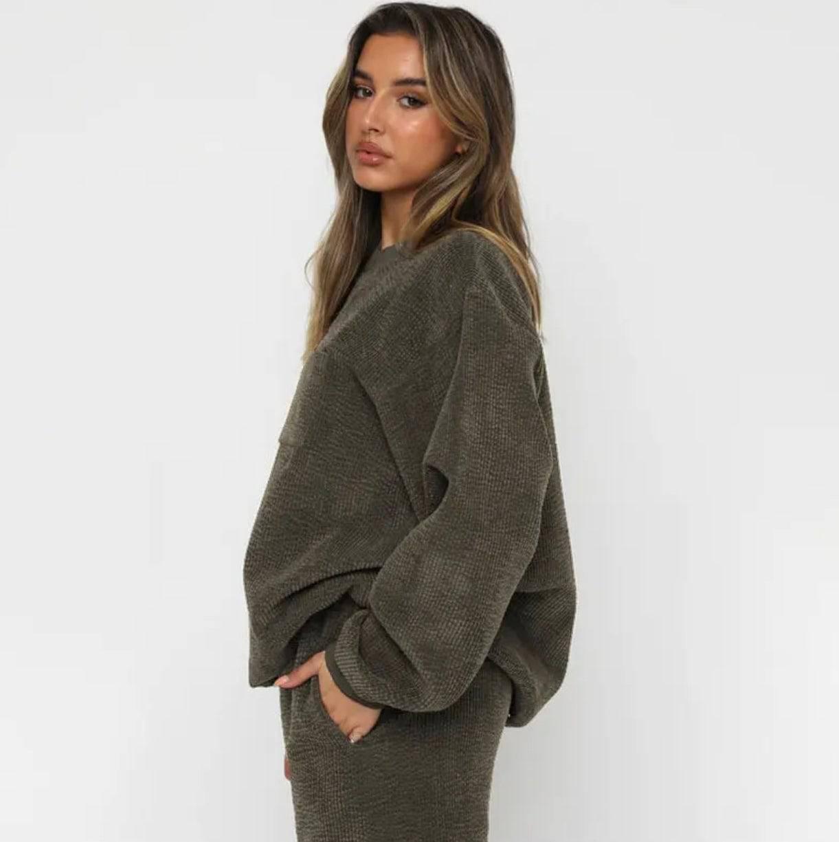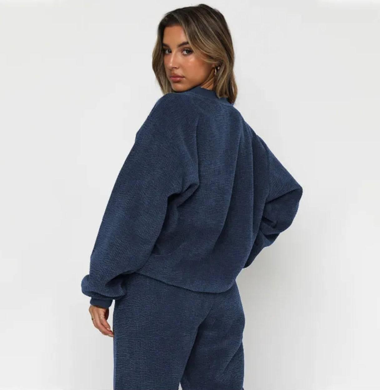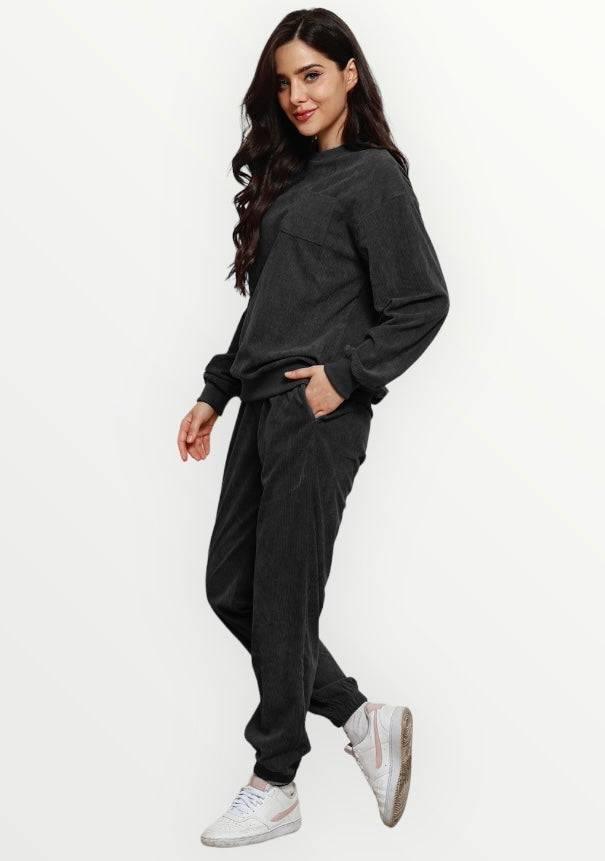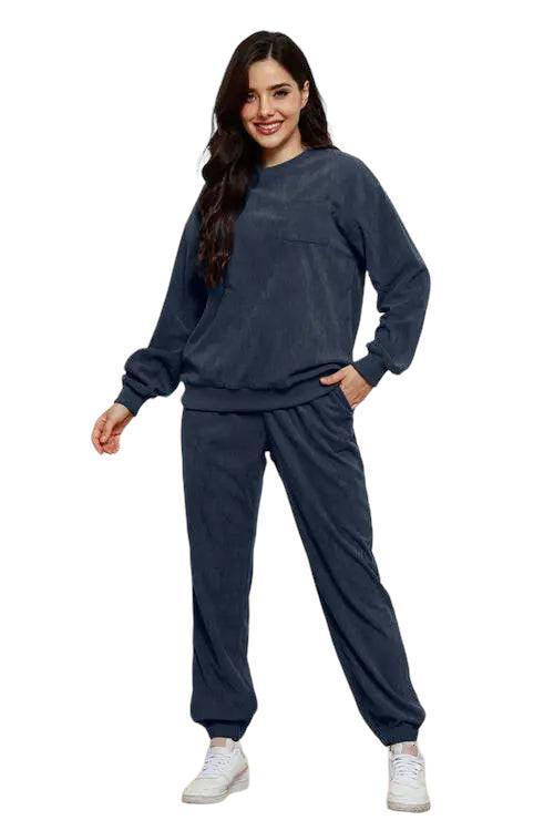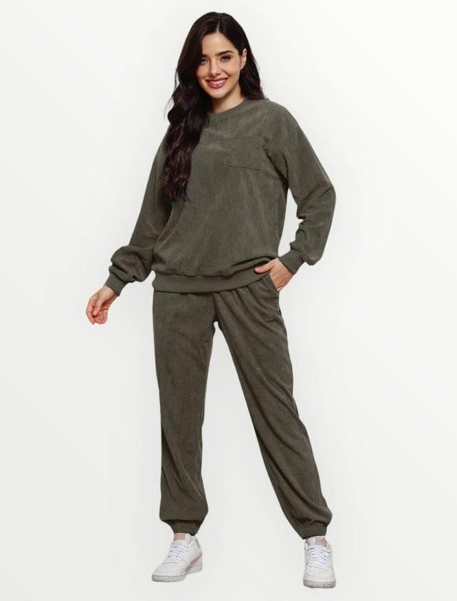 The versatility of our two-piece corduroy lounge set allows you to wear the pieces together as a coordinated set or mix and match them with other items in your wardrobe. Pair the top with jeans or leggings for a casual yet put-together look, or style the corduroy bottoms with a cozy sweater for added warmth.