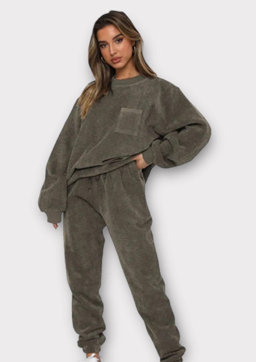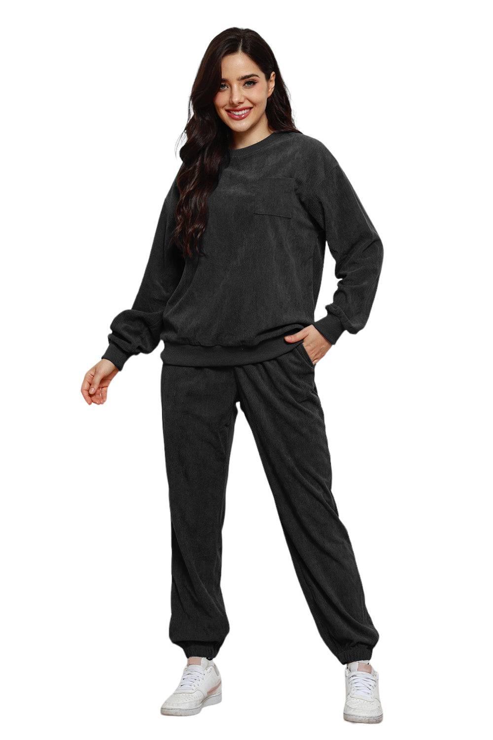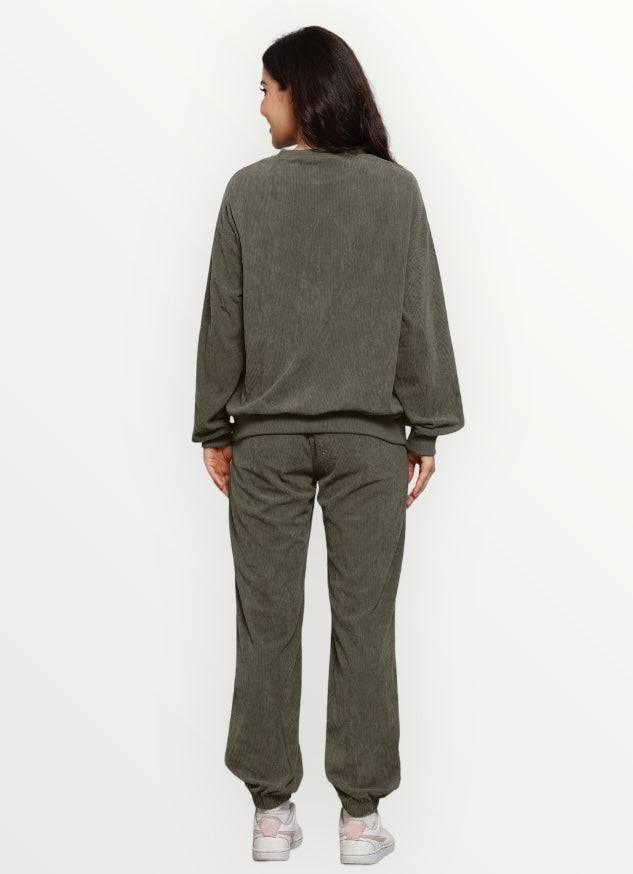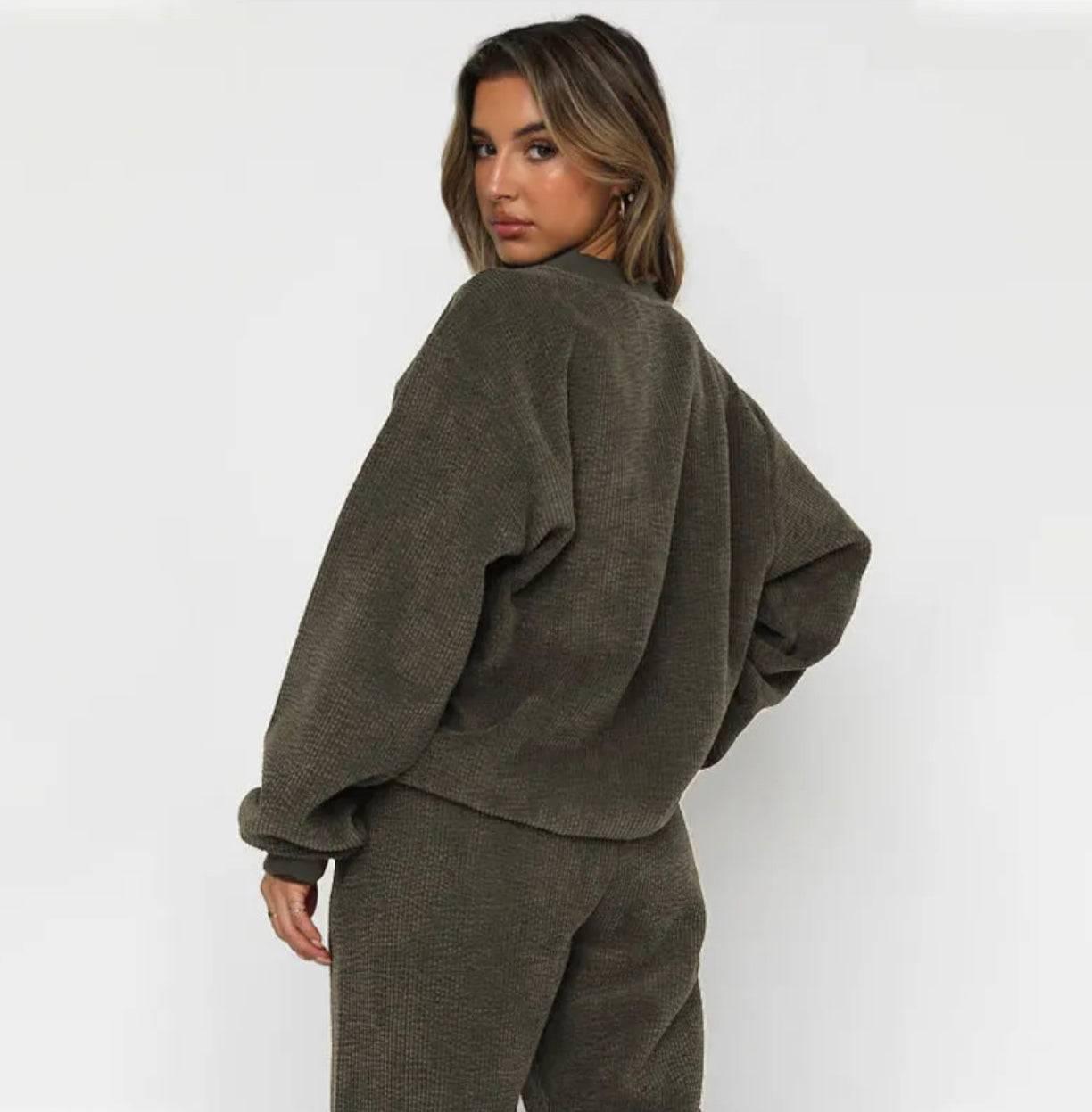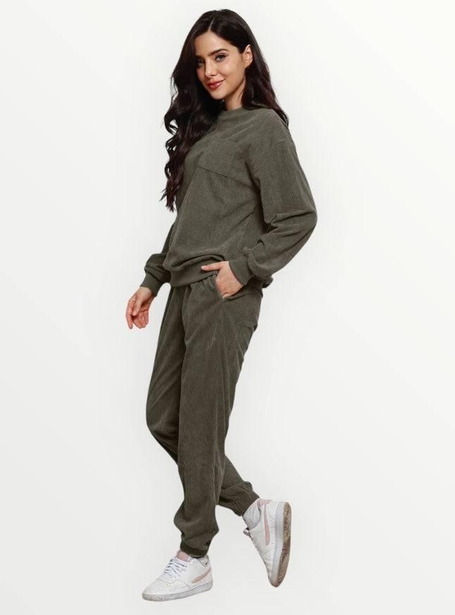 Our two-piece corduroy lounge set is a stylish and cozy outfit option for relaxing at home or running errands. It includes a matching top and bottom, both made from soft and textured light corduroy fabric.