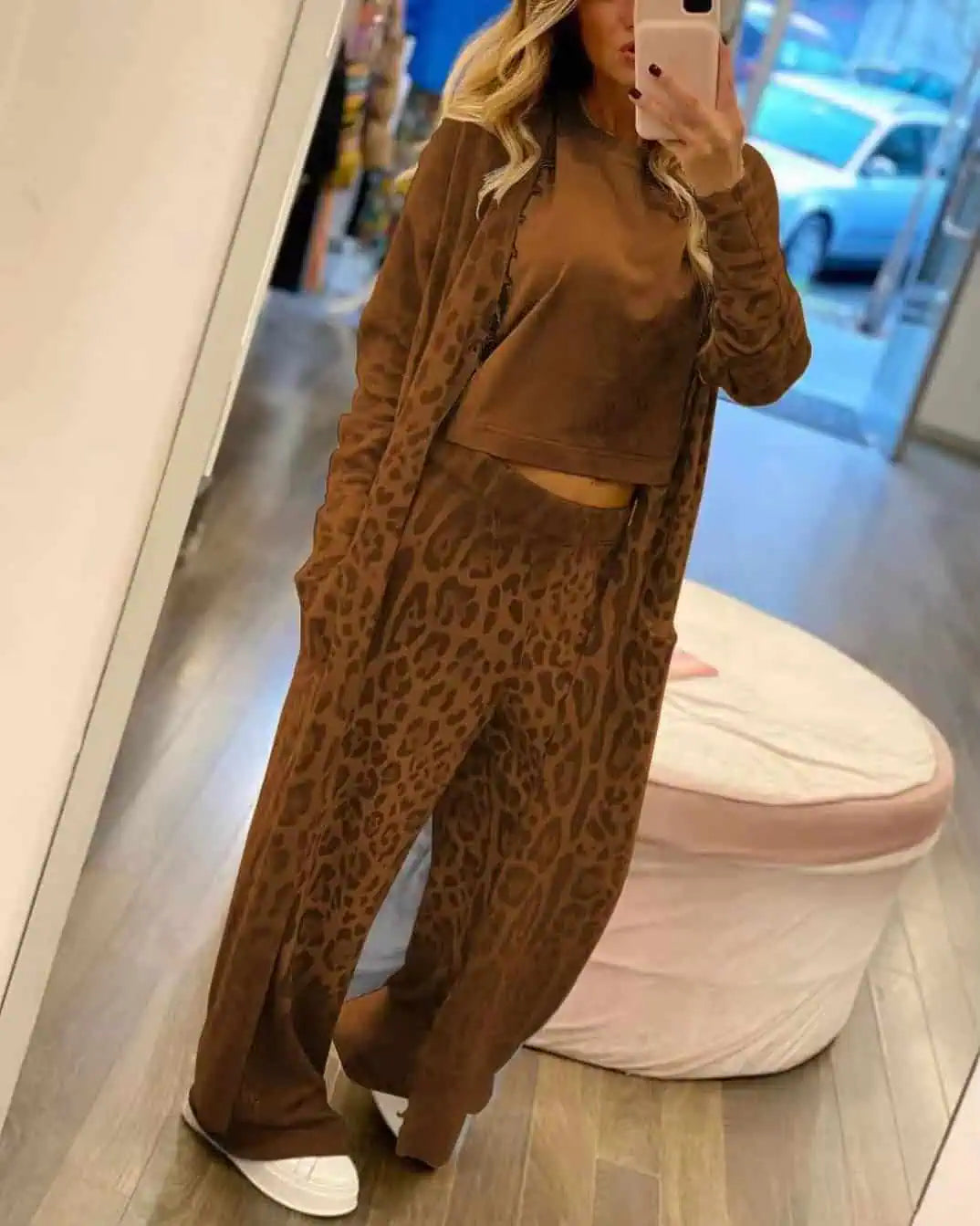 Long Sleeve Leopard Print Longline Top and Pants Set