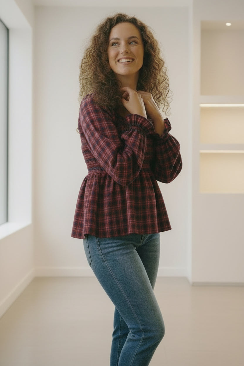 Bring a pop of playful plaid to your wardrobe with this darling smocked peplum top! Featuring a flattering square neckline, stretchy smocking through the bust, and a flared hem that adds the perfect feminine touch. This top is made for easy comfort and cute, casual styling. The long sleeves with ruffled cuffs give it a sweet finish, while the rich plaid pattern keeps it perfectly seasonal. Pair it with denim and booties for a look thatās cozy, confident, and effortlessly charming!