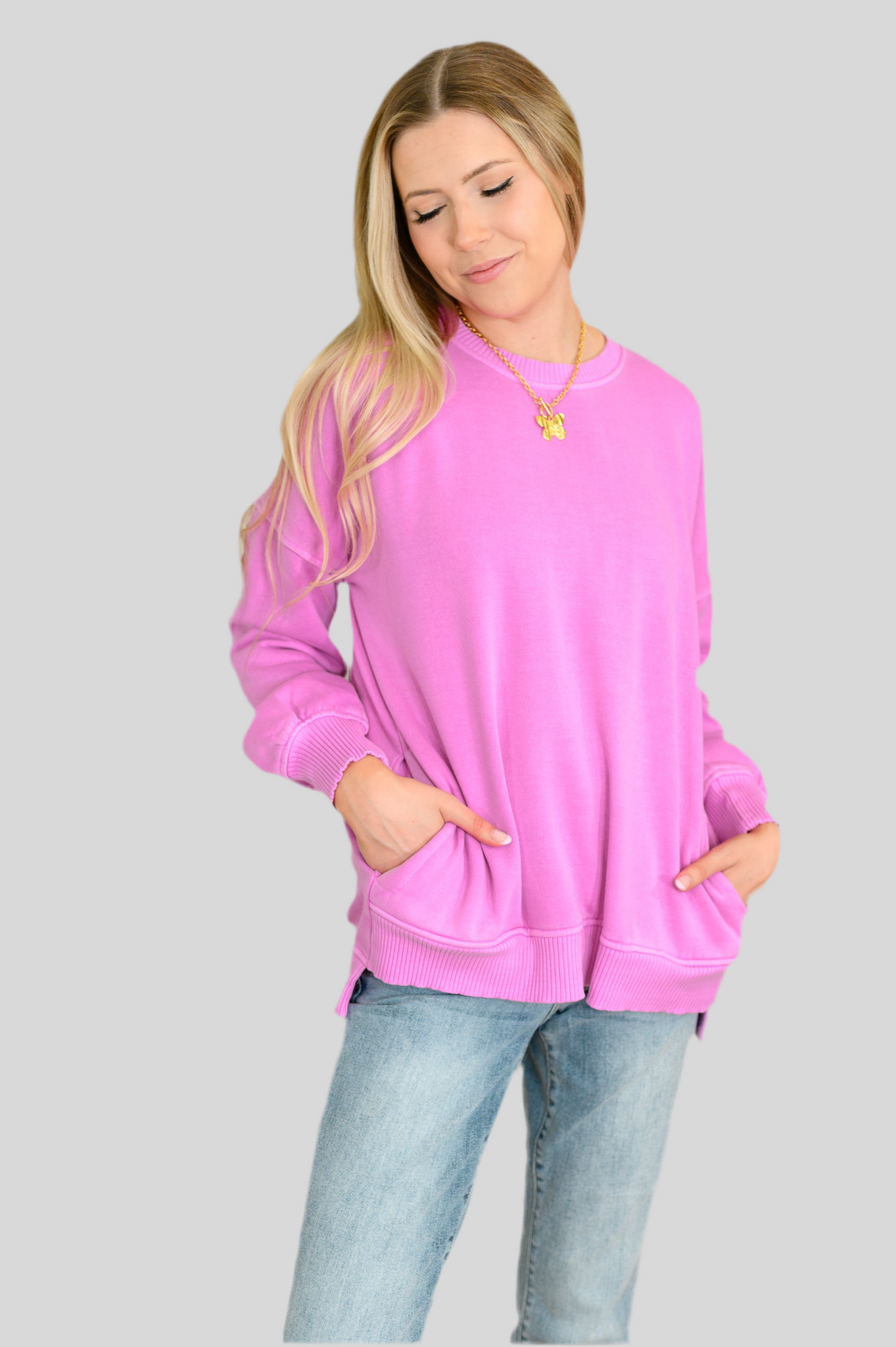 Soft, stretchy, and effortlessly chic — this Stepped Hem pullover in Bright Mauve has all the cozy details you crave. A ribbed round neckline, dropped shoulders, and banded cuffs create a relaxed silhouette, while functional side pockets and a stepped hemline keep it practical and polished.