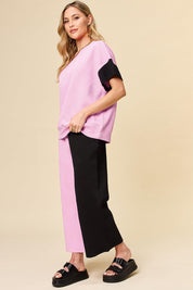 Double Take Full Size Texture Contrast T-Shirt and Wide Leg Pants Set