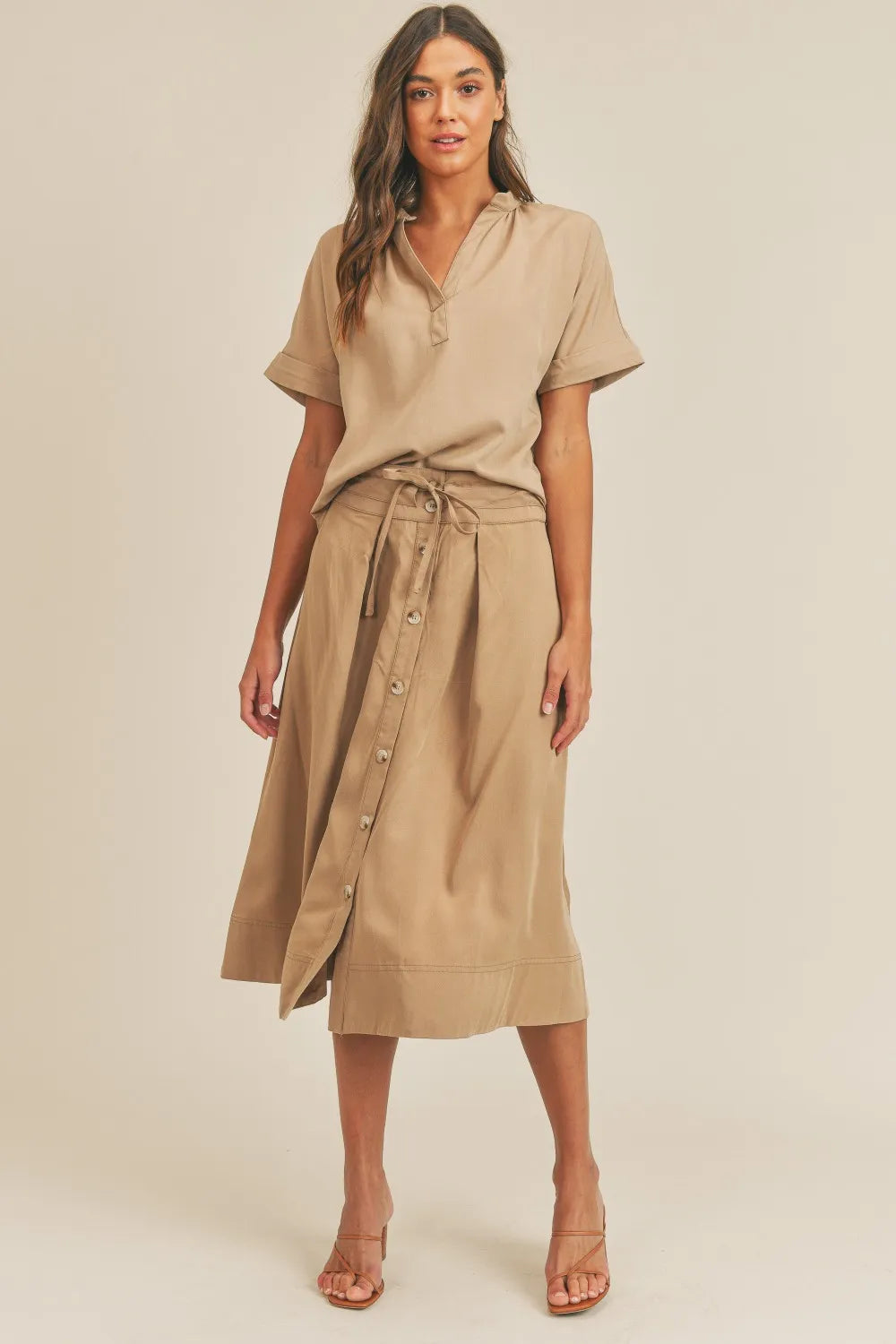 MABLE Short Sleeve Top and Button Down Midi Skirt Set