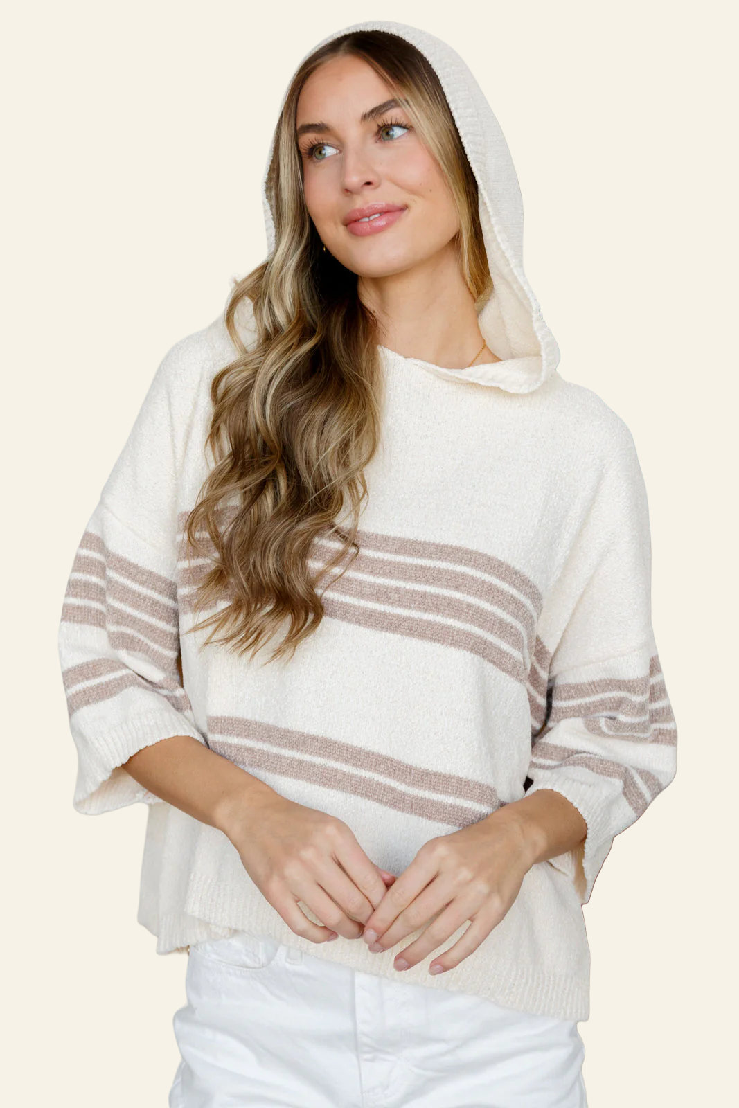 Stay cute and cozy with our sweater knit striped hoodie! Made from a soft and lightweight sweater knit, this hoodie features a hood and brown stripe accents for a touch of flair. The drop shoulder and half sleeve give it a relaxed feel, while the ribbed sleeve cuffs and hem add a trendy touch. Perfect for staying warm and fashionable.