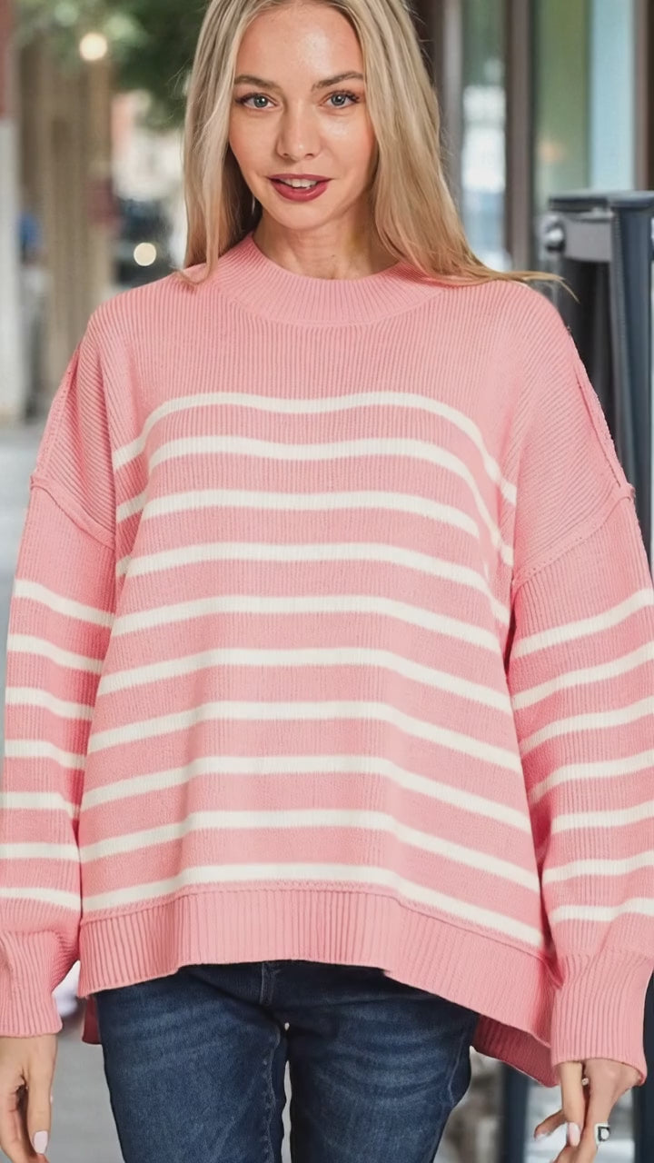 Zenana Exposed Seam Striped Oversized Sweater Pink