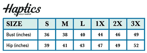 Bust (side seam to side seam): S 20" M 21" L 22" 1X 25" 2X 26" 3X 27"