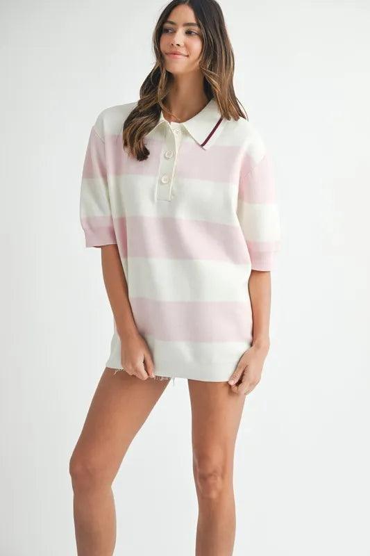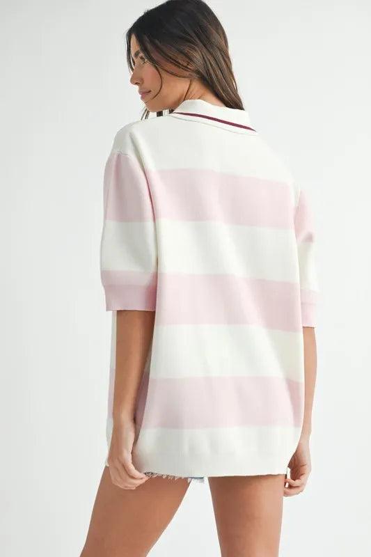 The Oversized Stripe Polo Collar Sweater Top is a fashionable and cozy addition to your wardrobe. The oversized fit makes it perfect for casual, relaxed days. The stripe design and polo collar add a sporty and stylish touch to the look.