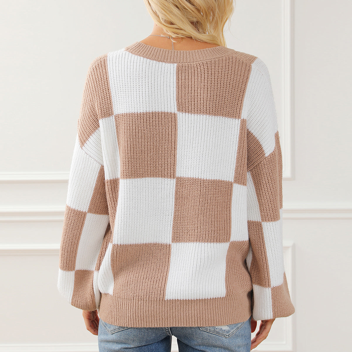 Women’s Round Neck Drop Shoulder Long Sleeve Tan Checkered Sweater