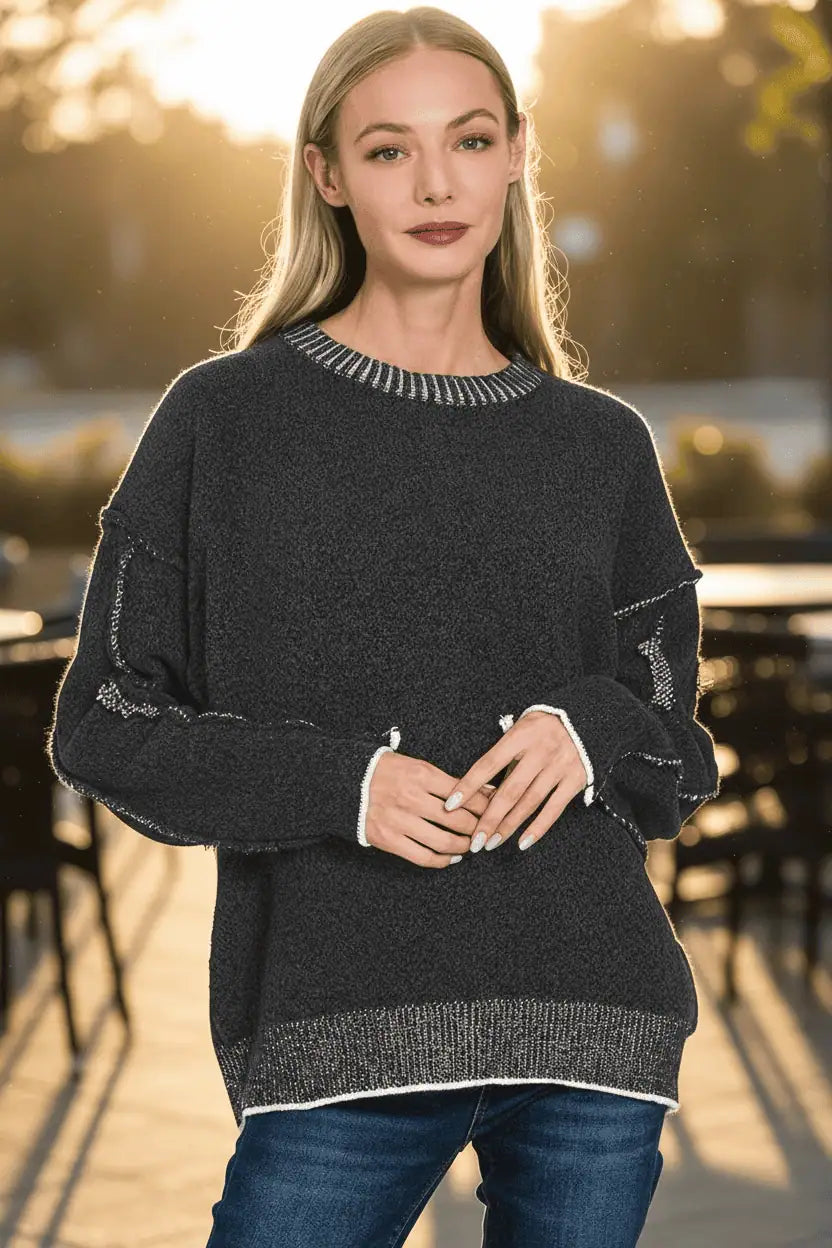 Zenana Exposed Seam Round Neck Two-Tone Sweater