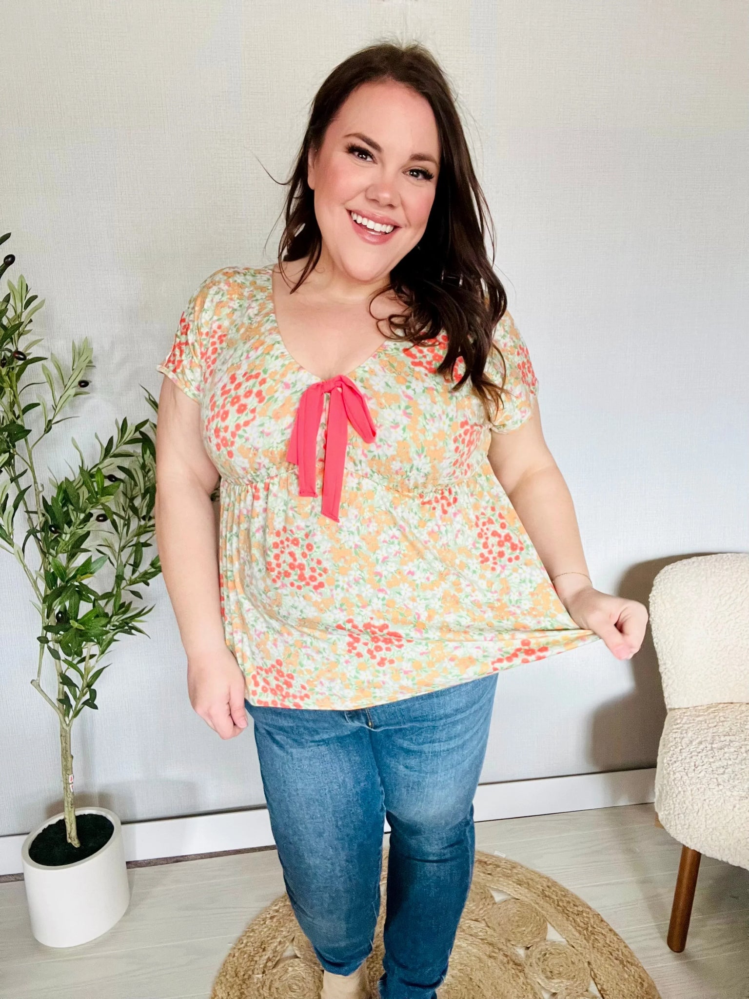 Turn heads with this unique peasant styled top featuring floral print and a ribbon bow tie. With short cap sleeves and a slight high-lo silhouette, be prepared to charm in this top!