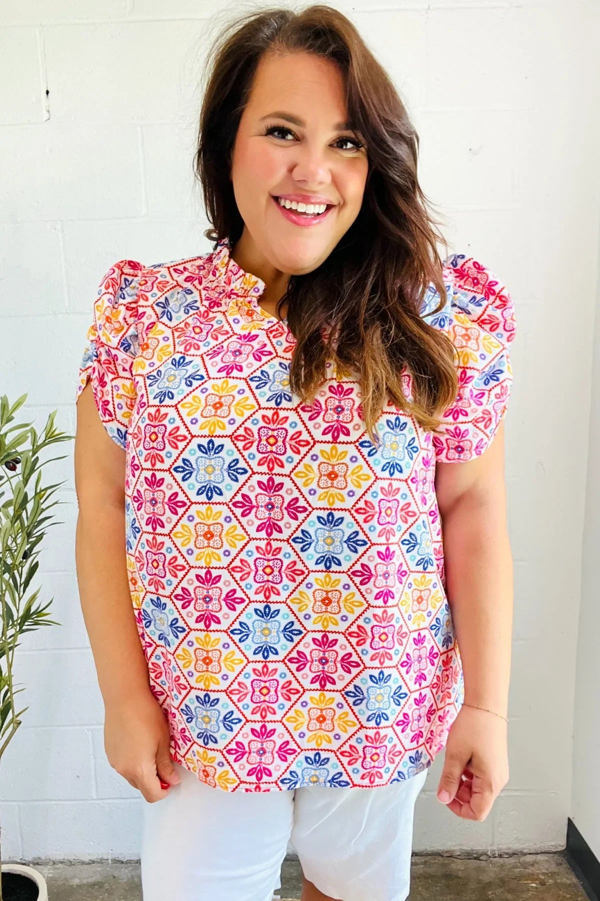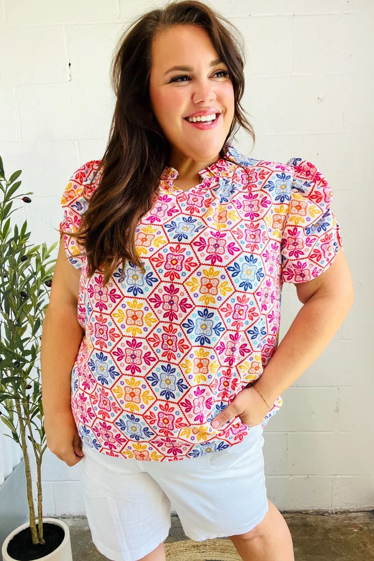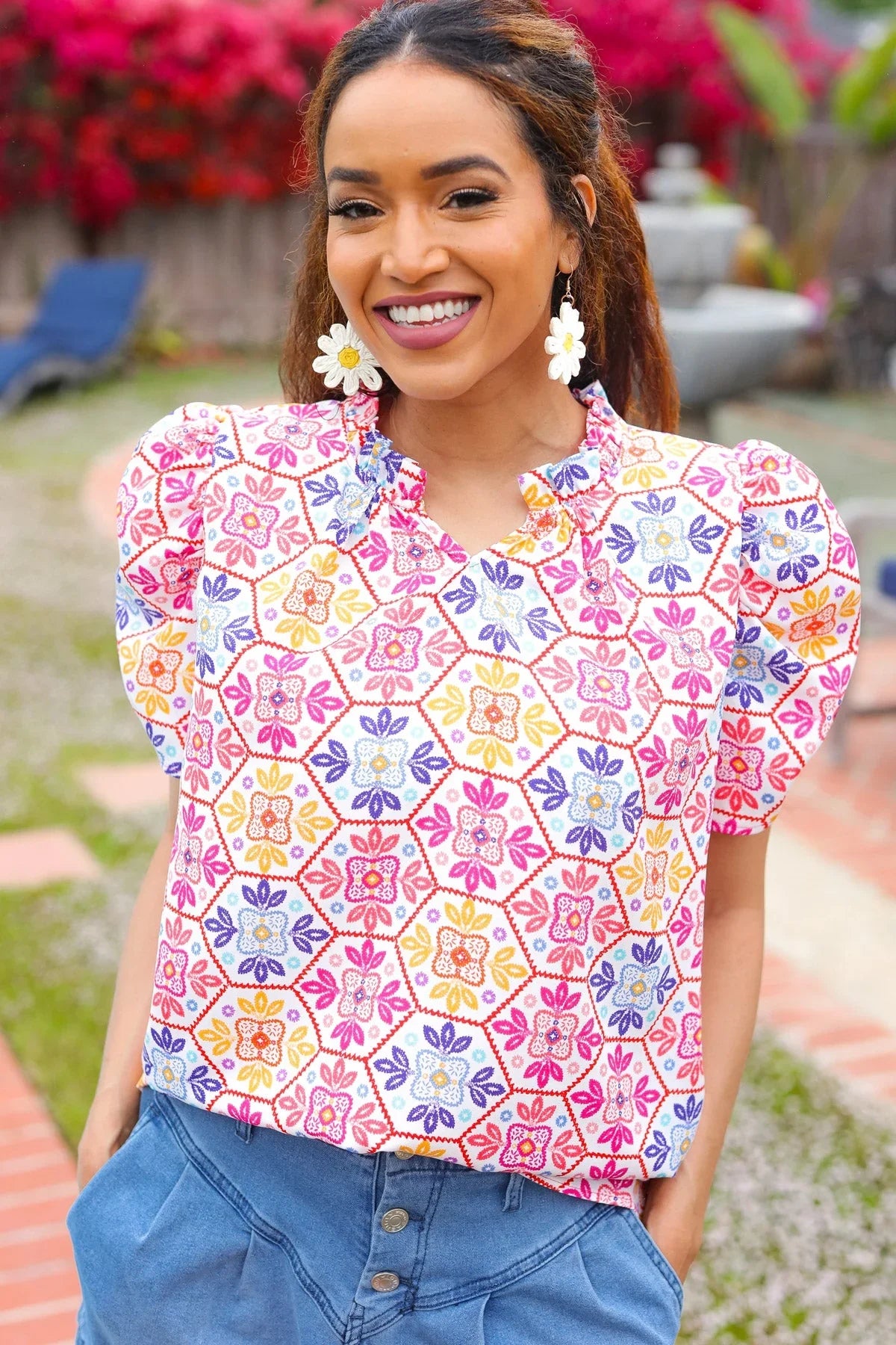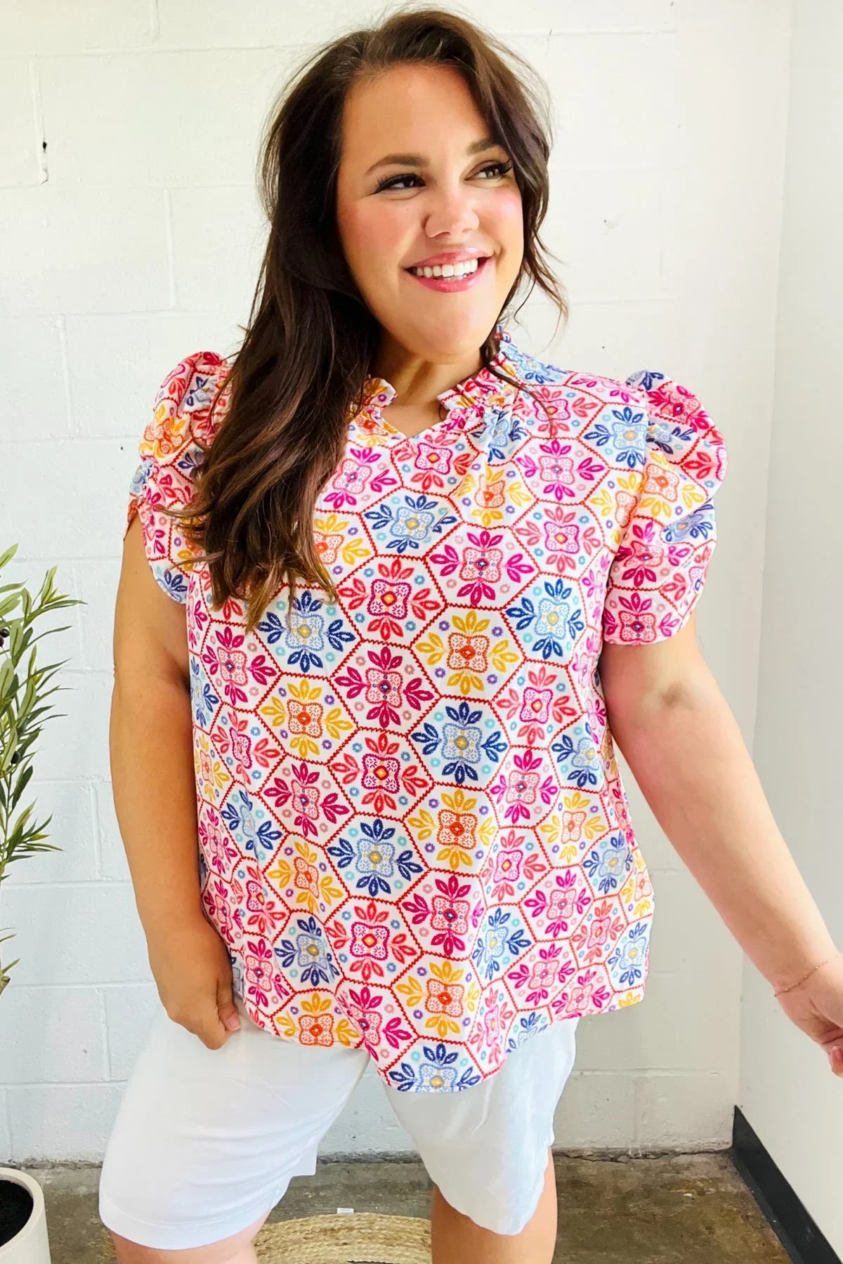 Beautiful You Ivory Floral Lace Frill Notch Neck Puff Sleeve Top