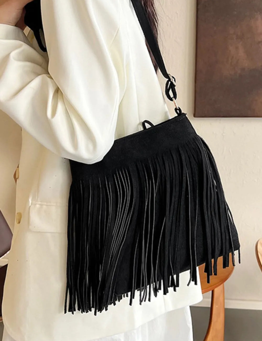Suede Fringe Adjustable Strap Shoulder Bag - variante de color: Black