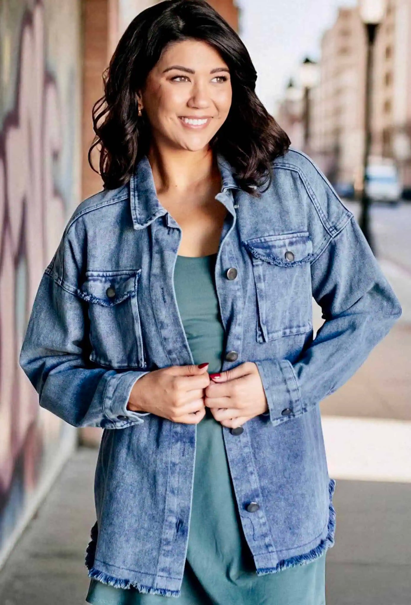 This must-have piece features a classic button-front closure and a practical front pocket. The trendy drop shoulder and raw edge detailing on the hem add a touch of effortless style, making it a standout piece in any wardrobe.