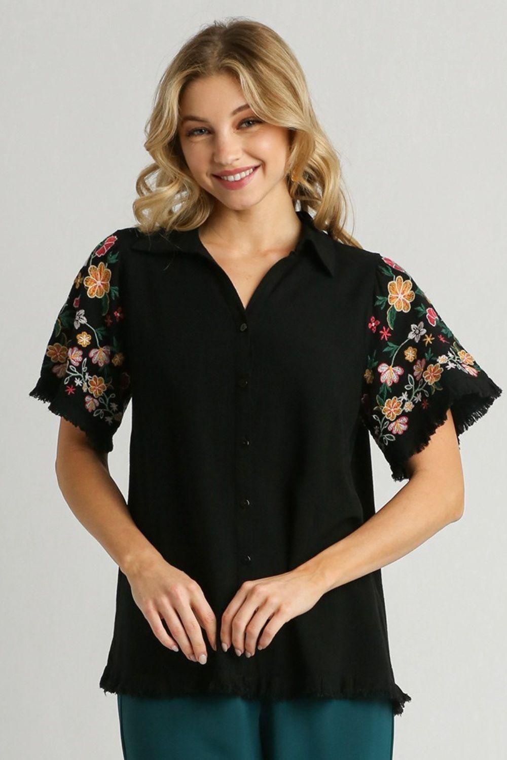 Umgee Full Size Linen Shirt with Embroidered Sleeves Plus Size