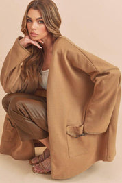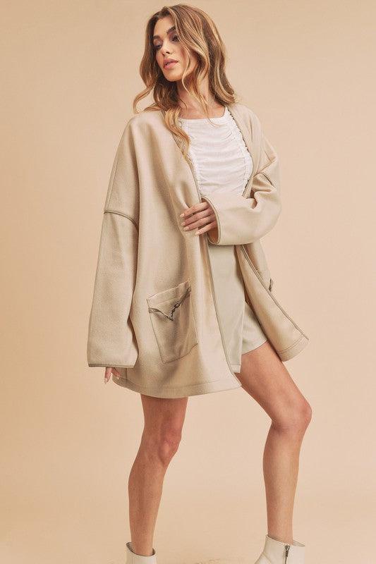 Esme Kimono Jacket is tailored to a slouchy silhouette with vegan leather detailing throughout the garment.