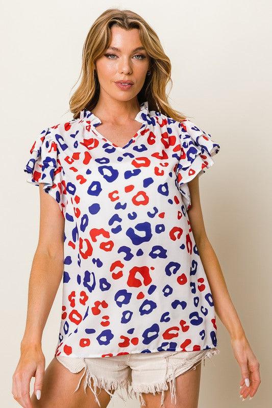 BiBi Leopard Notched Ruffled Cap Sleeve Blouse