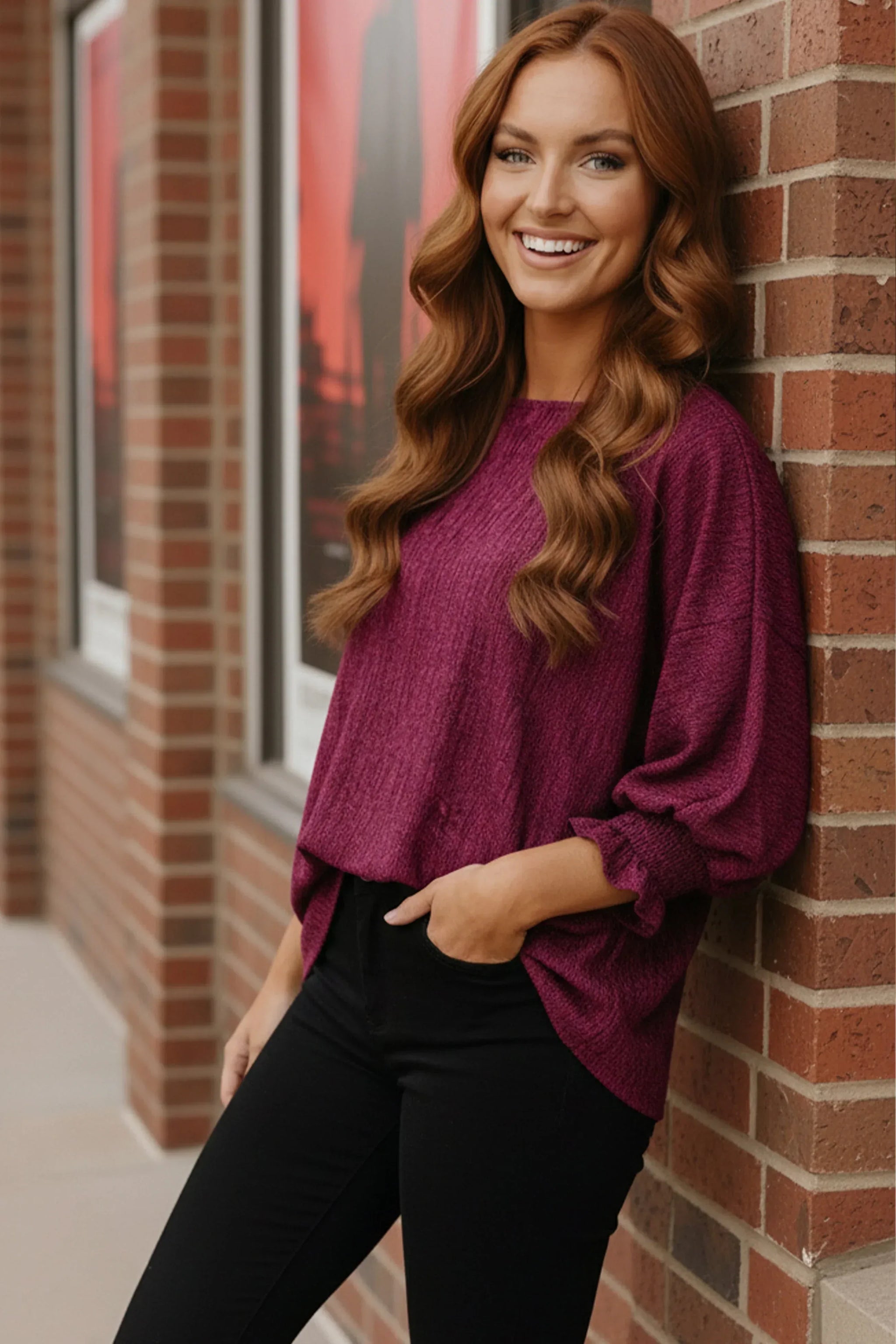 Turn heads in this stunning fuchsia sparkle oversized blouse designed to bring instant charm to any outfit. Featuring playful puff sleeves with ruffled cuffs, this top adds the perfect touch of feminine flair while keeping things effortlessly chic. The textured ribbed fabric drapes beautifully and moves with you, giving it that elevated but easy party feel. Dress it up with black skinnies and heels for your next holiday party or night out!