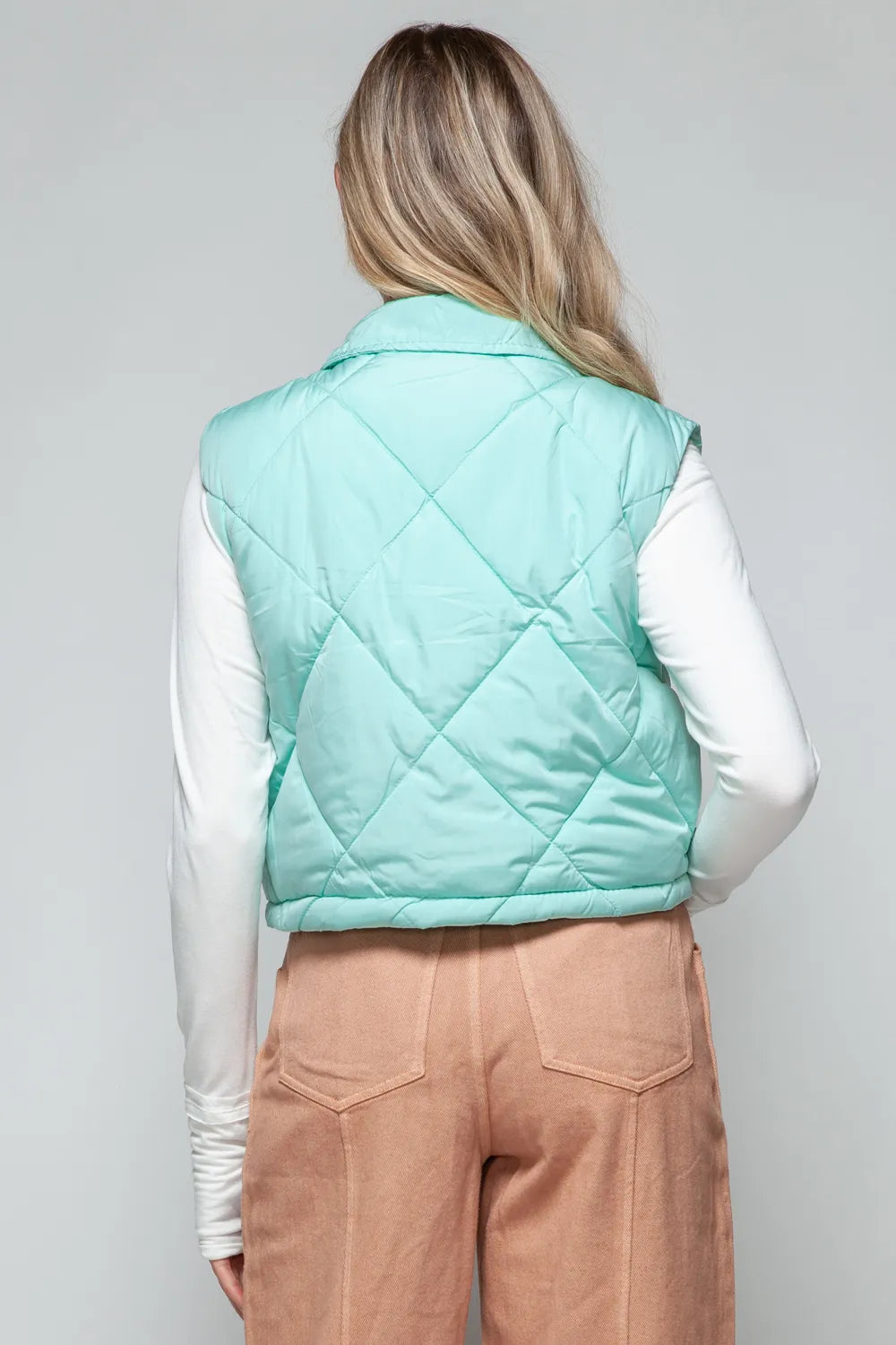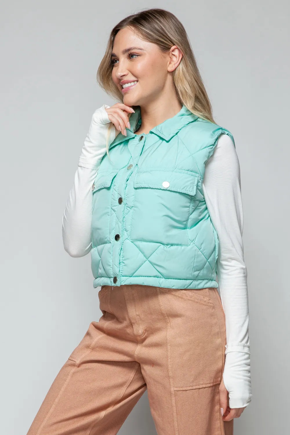The snap-down quilted crop vest is a stylish and versatile addition to your wardrobe. With its snap-button closure and cropped length, this vest offers a modern and edgy look. The quilted design adds texture and interest to the vest, perfect for layering over tops or dresses. Featuring a flattering cropped silhouette, this vest is great for adding warmth and style to your outfits. Stay on-trend and cozy with this chic snap-down quilted crop vest, ideal for both casual and dressed-up occasions. Elevate your look with this fashionable and functional piece that will keep you stylish all season long!