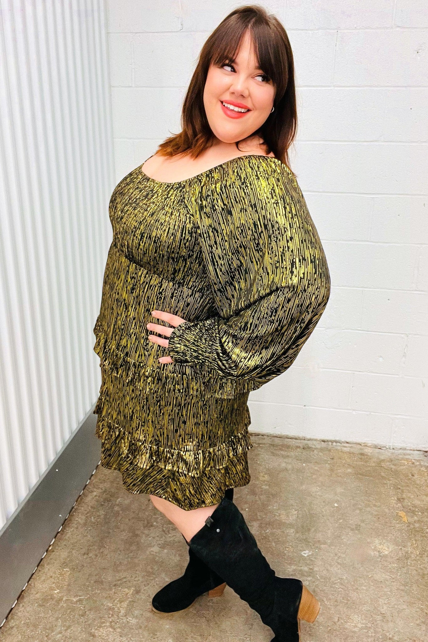 Get holiday party ready with this smocked chest gold foiled dress. Smocked cuff bubble sleeves and tiered ruffle design complete this stunner!