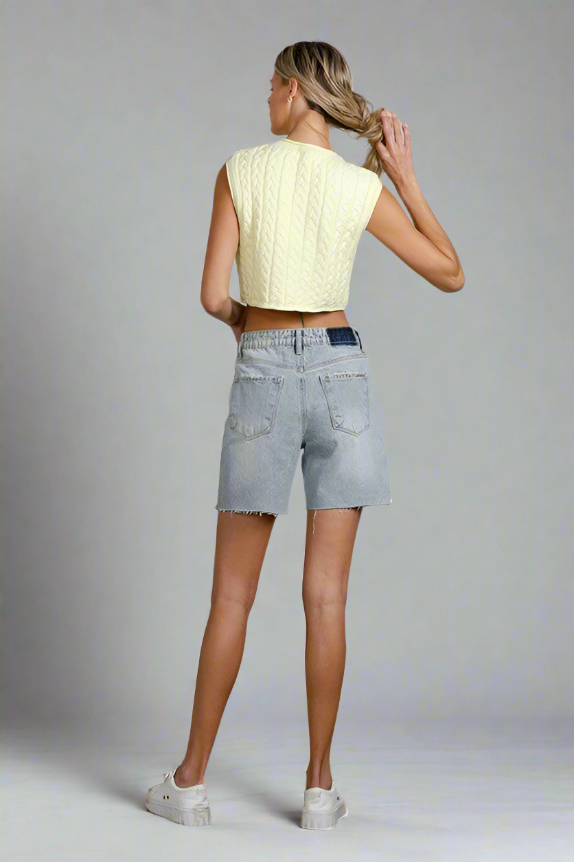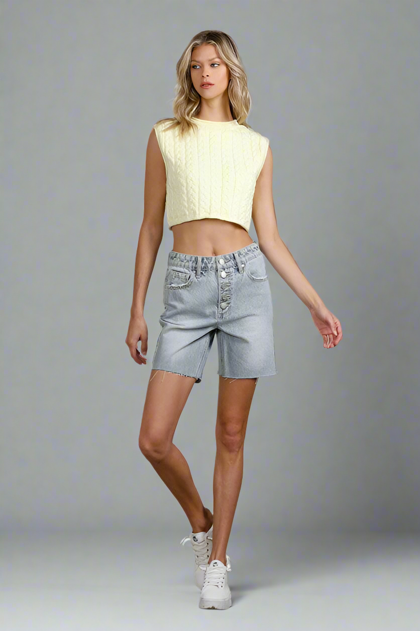 Button Down Raw Hem Denim Shorts