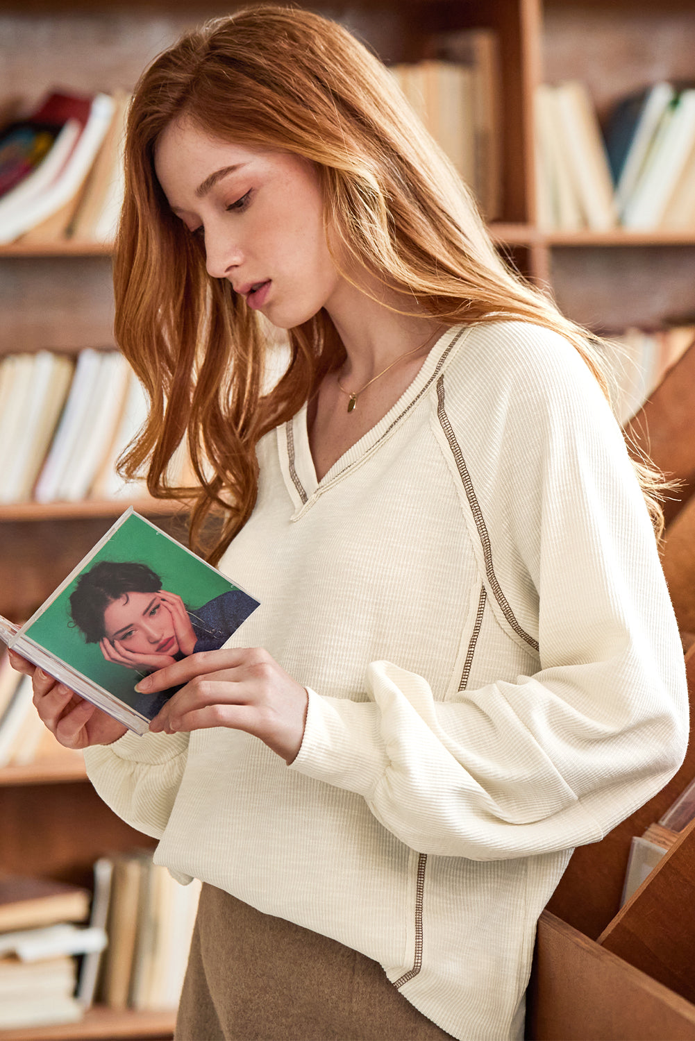 Beige Exposed Seam Textured Knit V Neck Pullover Top