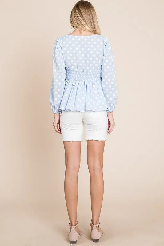 Make a statement with this polka dot print balloon sleeve babydoll peplum top. The polka dot print adds a playful and retro-inspired touch to the top. The balloon sleeves create a dramatic and eye-catching silhouette. The babydoll peplum design is flattering and adds a feminine flair. Pair with jeans or a skirt for a stylish and chic ensemble. Stand out in style with this trendy and unique top.