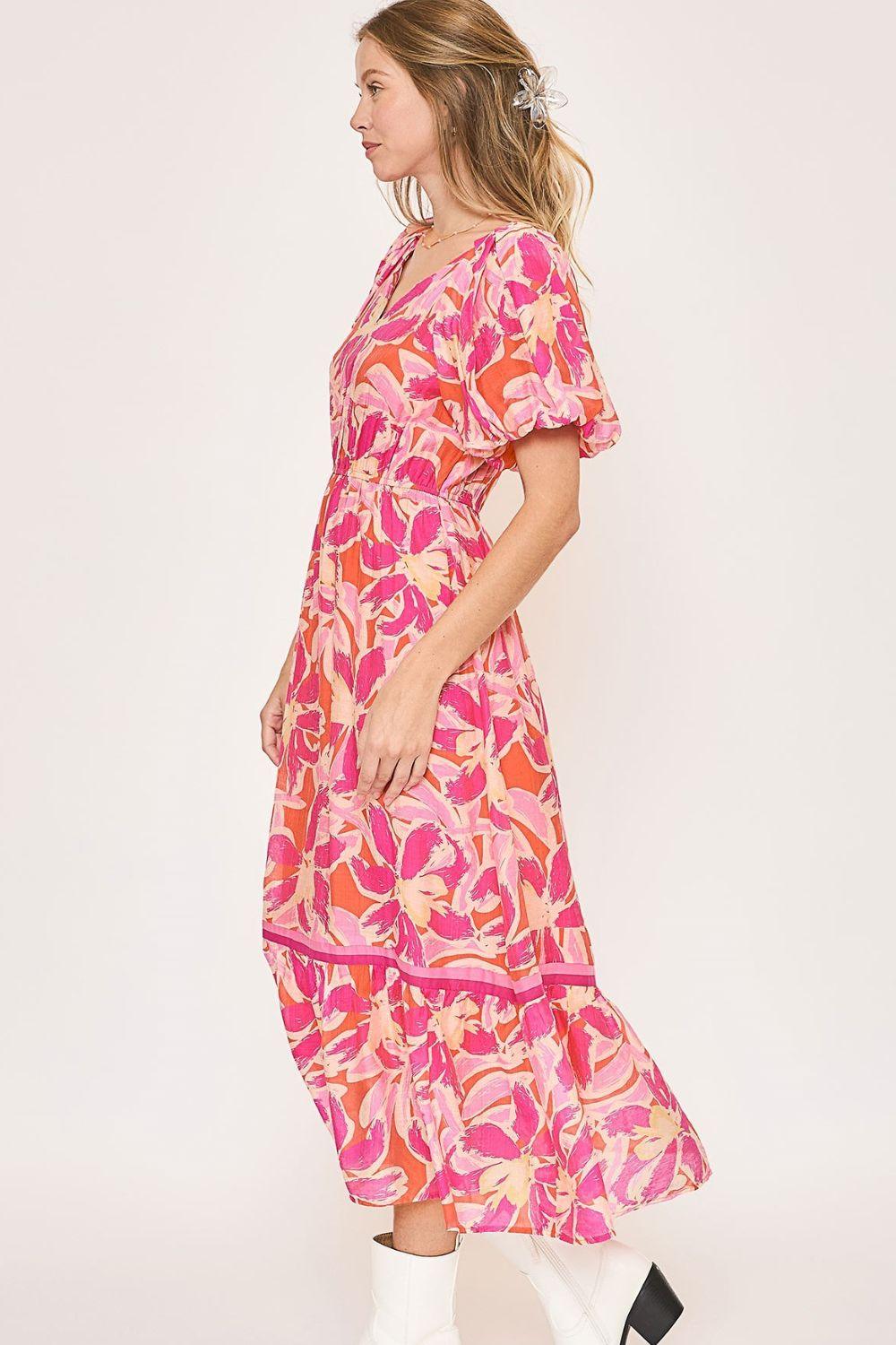 Umgee Floral Notched Puff Sleeve Midi Dress