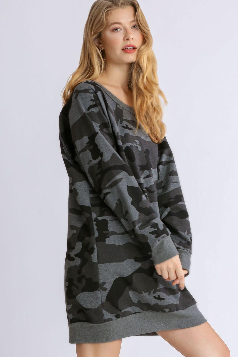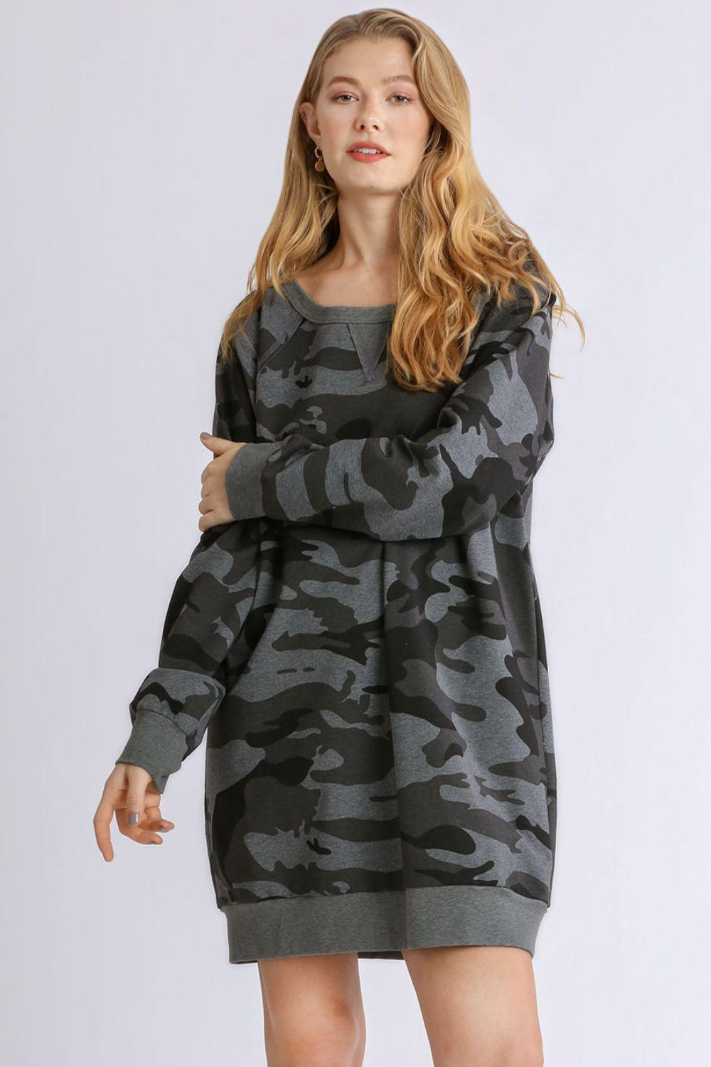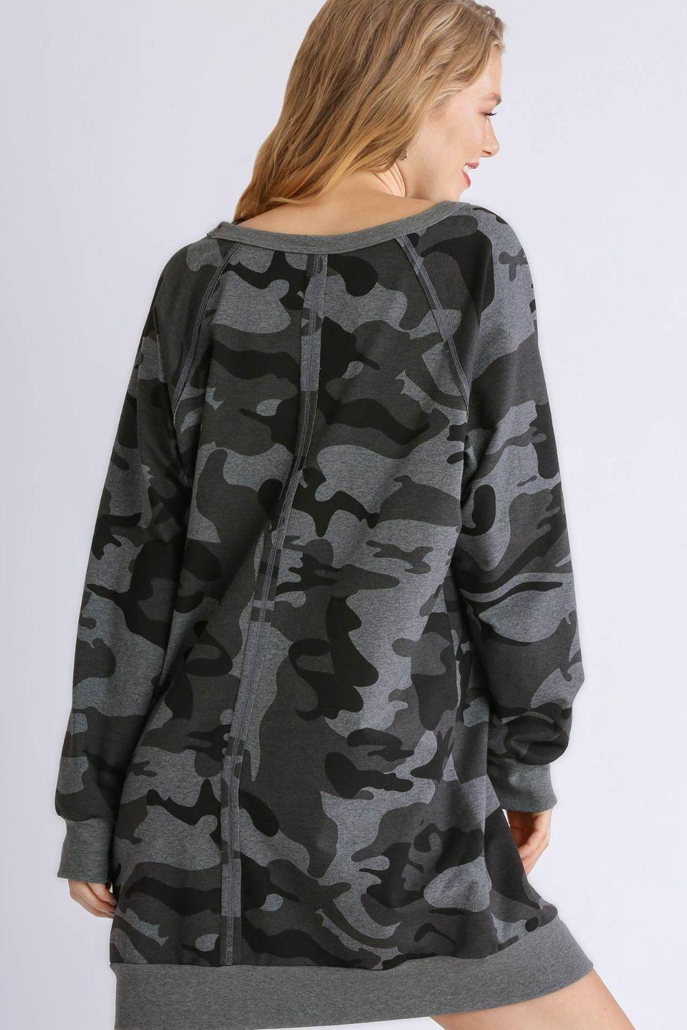 Umgee Full Size Camo Print Ribbed Hem French Terry Mini Dress Plus Size