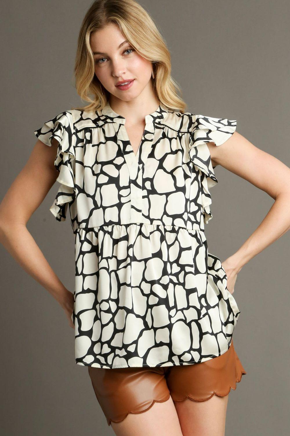 Umgee Full Size Two Tone Animal Print Notched Ruffle Cap Sleeve Blouse Plus Size