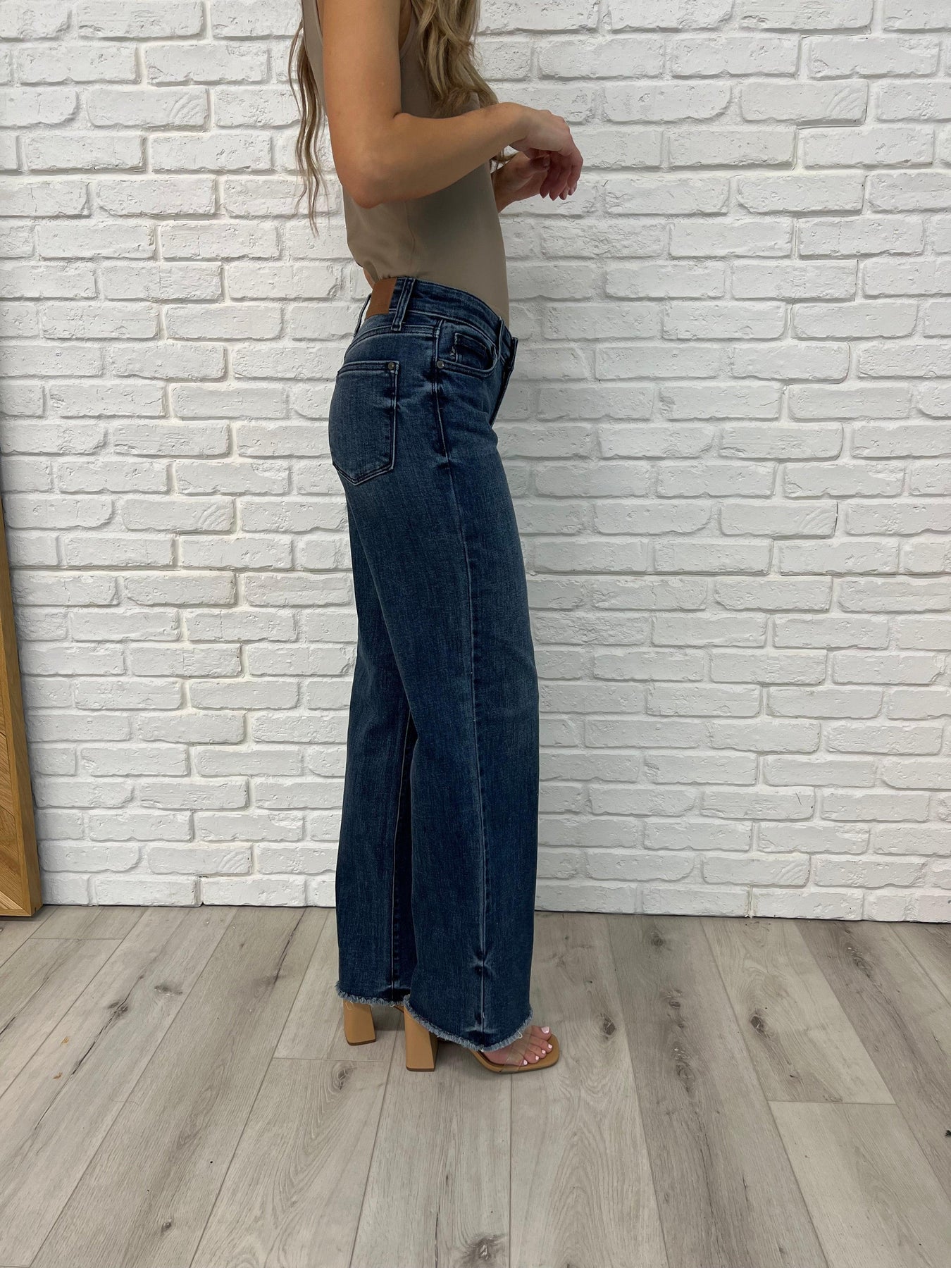 Get ready to rock a vintage look with the Addie Mid Rise Jeans! With a dark vintage wash and cut off raw hemline, these jeans bring a touch of nostalgia to your wardrobe. The wide leg silhouette adds a modern twist, while the released hem detail keeps you looking effortlessly cool.