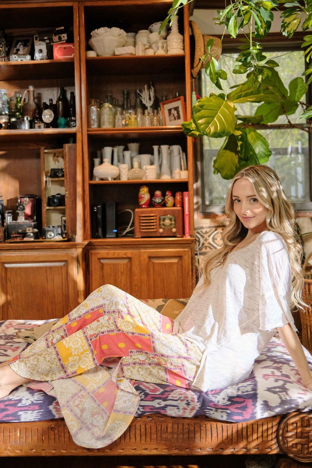 And The Why Printed Smocking Waist Side Slit Wide Leg Pants