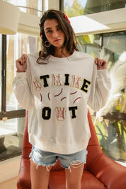 This fashion baseball-themed sweatshirt features a playful 'STRIKE OUT' graphic design with baseball stitching details. Made from a soft and comfortable cotton blend material, it offers both style and comfort. The classic crewneck design with ribbed trim provides a traditional sporty look. The relaxed fit and long sleeves make it perfect for casual wear or showing team spirit. The white base color creates a clean, versatile canvas for the statement graphic. Ideal for baseball season, casual outings, or loungewear.