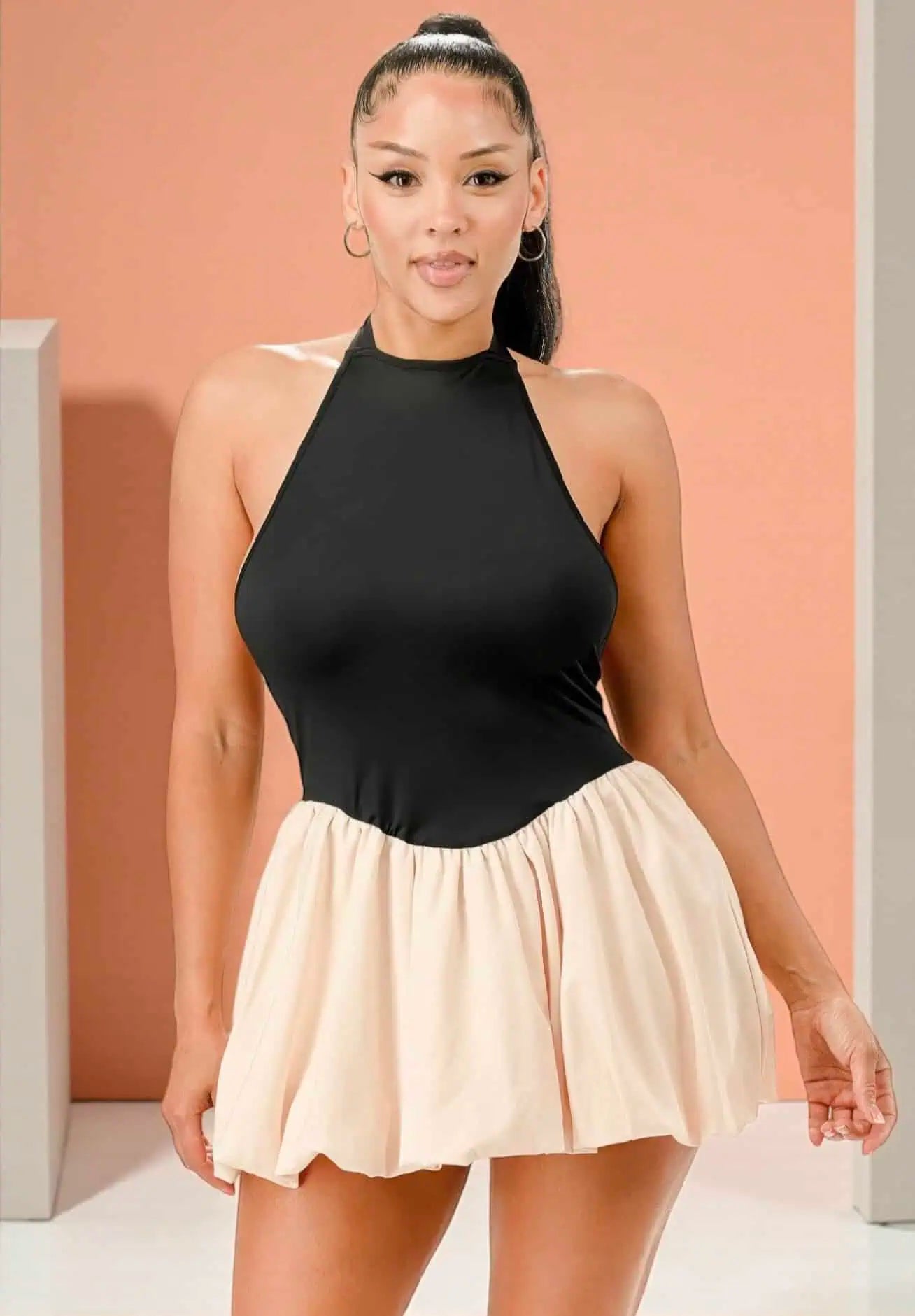 Make a bold statement in this playful yet sophisticated bubble mini dress, designed to turn heads from every angle. Featuring a sleek mock neckline with a halter tie-back, this silhouette highlights the shoulders while offering a dramatic open-back design. The voluminous bubble hem adds texture and a fun, fashion-forward shape, creating a standout look perfect for parties or night outs. Crafted from a stretch-blend fabric, it hugs comfortably while maintaining structure. Available in classic black, it’s a modern take on a timeless mini.