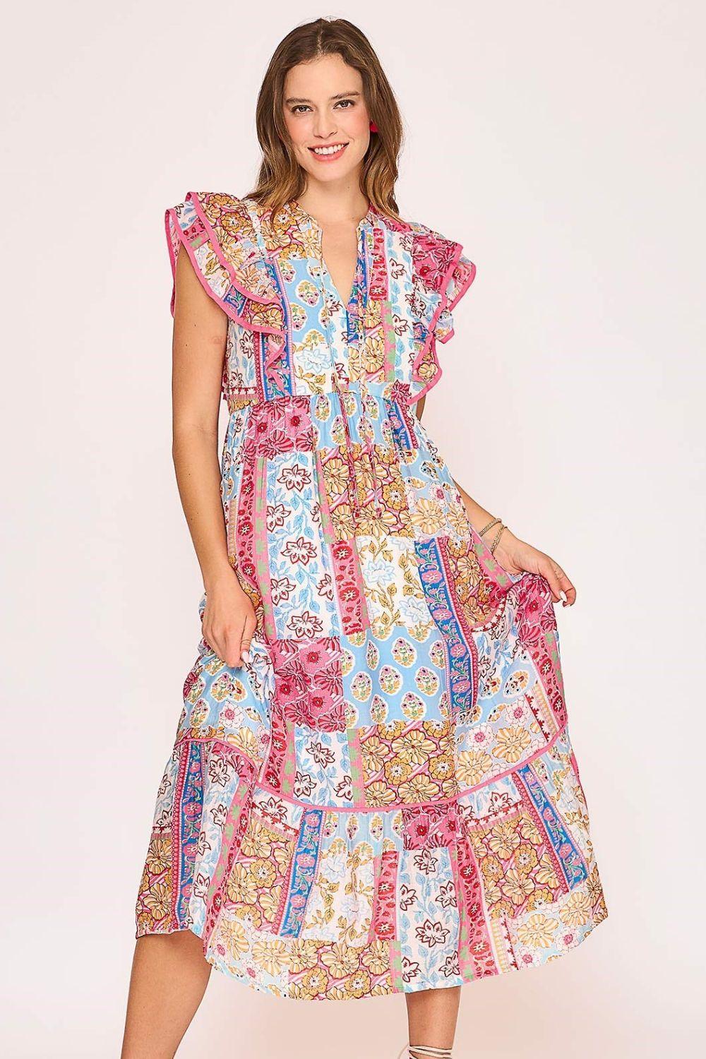 Umgee Full Size Tie Neck Double Layered Ruffle Sleeve Midi Dress Plus Size